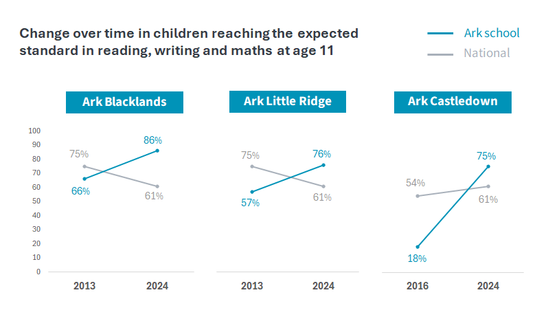 Since joining the Ark network, each of the three primary schools has seen improved results in the number of children reaching the expected standard in reading, writing and maths: