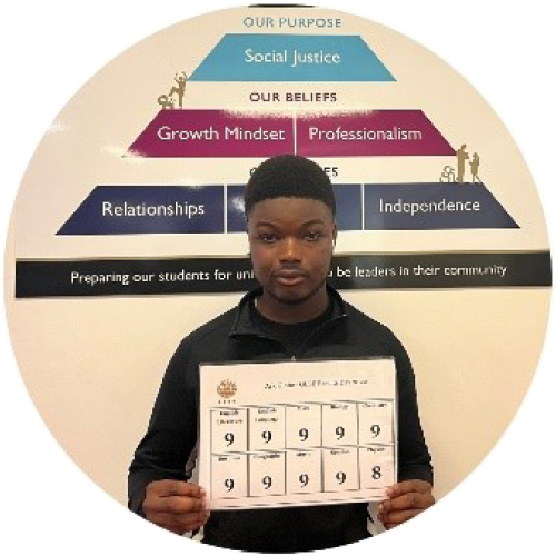 Issah achieved nine 9s and one 8, securing himself a full scholarship at Eton College, and hopes to attend Oxbridge for university. Issah has been consistently hard-working and contributed to the wider life of the school through music and supporting his peers, and has been a real asset to the school. Issah said: “My Learning Family Lead Miss Malcolm has been the most helpful in my journey, she has always been there to guide me and motivate me, so I am really thankful to her. In Sixth Form, I will be studying Maths, Chemistry, Biology and Economics. What I want to do most is to positively impact people, the community around me, my family and myself. I will give my best and try my hardest.”