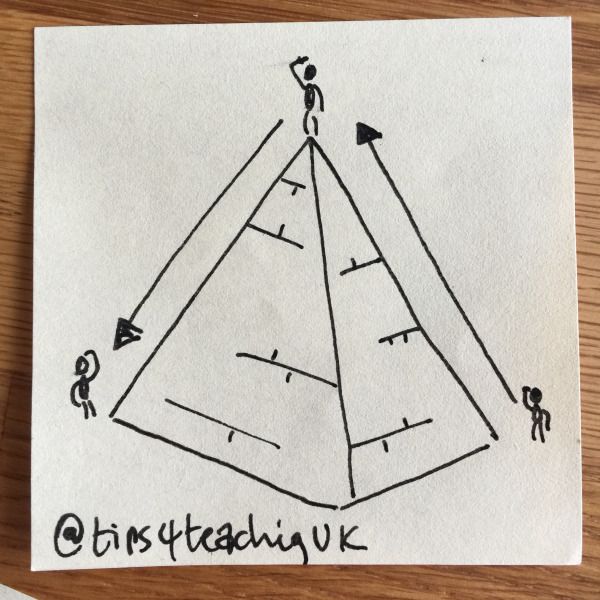 It allows me to challenge lower ability learners first, which I find ‘switches them (and others) on’. I then take their answers and carefully question more able learners to build on that answer. Then, instead of ending on what I might think is the best answer I might get, I pause and work my way back through other less able learners. The aim is to allow the second set of learners to give fuller answers than those who went at the very beginning. It really helped me to measure the understanding across a larger number of learners than if I had ‘stopped at the top’.